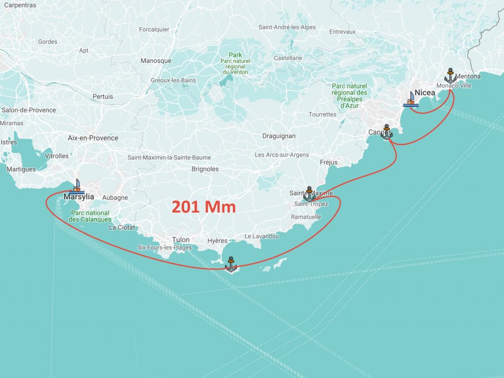 Odwiedzone miejsca: Port Cap D’Ail (Monacco), Ile Sainte-Marguerite (kotwica), St-Tropez, de Giens (kotwica), Port de Pomegues (kotwica)