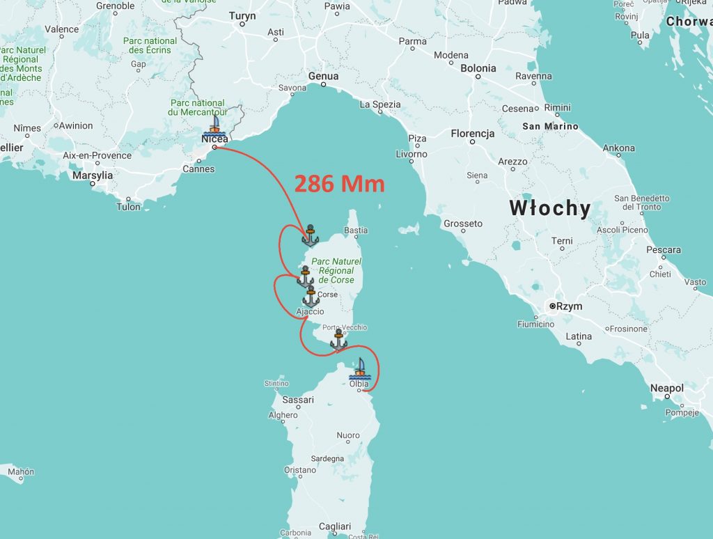 Odwiedzone miejsca: Port of Calvi, Punta de Ficajola (kotwica), Porto Tino Rossi Ajaccio, Plage de Cupabia (kotwica), Plage de Tralicetu (kotwica), Port de Bonifacio, Santa Maria (kotwica), Mortorio (kotwica)