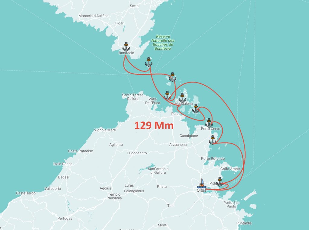 Odwiedzone miejsca: Capriccioli (kotwica), Porto Cervo (kotwica), Captera (kotwica), La Maddalena (Cala Gavetta), Lavezzi (kotwica), Port Bonifacio, Santa Maria (kotwica), Spargi (kotwica), Secca dei Porri (kotwica)