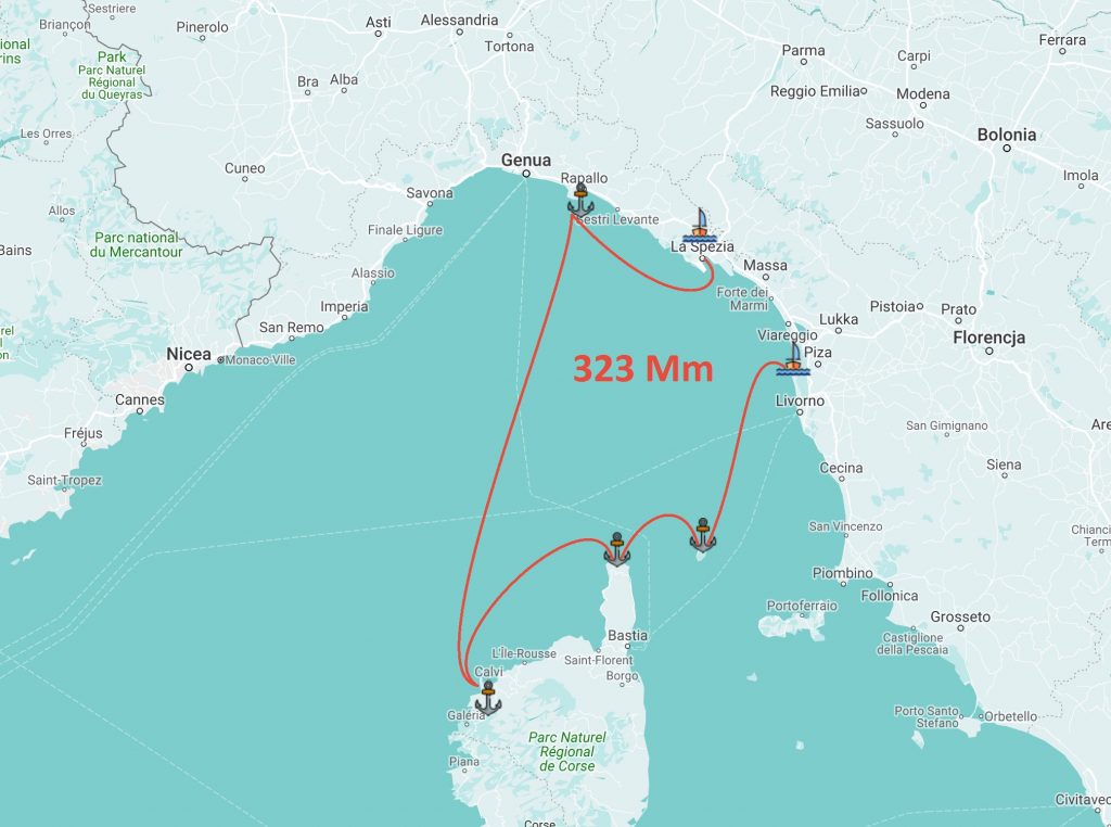 Odwiedzone miejsca: Porto Capraia, Cap Corse (kotwica), Port de Calvi, Baie Algajo, Seno di Paraggi (kotwica), Santa Margherita (kotwica), Vernazza (kotwica), Portovenere (kotwica), Lerici s. Terenzo