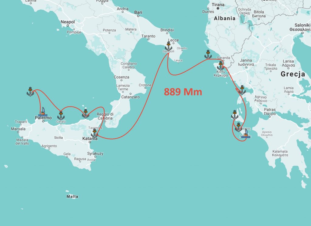 Odwiedzone miejsca: Ustica Cala St. Maria, Ba ia di Mondello (kotwica), Cefalu (kotwica), Milazzo Marina Poseidon, Taormina (kotwica), Riposto, Gallipolli (kotwica), Gallipolli Blue Samanto, Othonoi (kotwica), Mathraki (kotwica), Corfu, Preveza, Zakinthos, Ajos Nikolaos, Argostoli (kotwica), Wreck Bay (kotwica), Keri (kotwica)