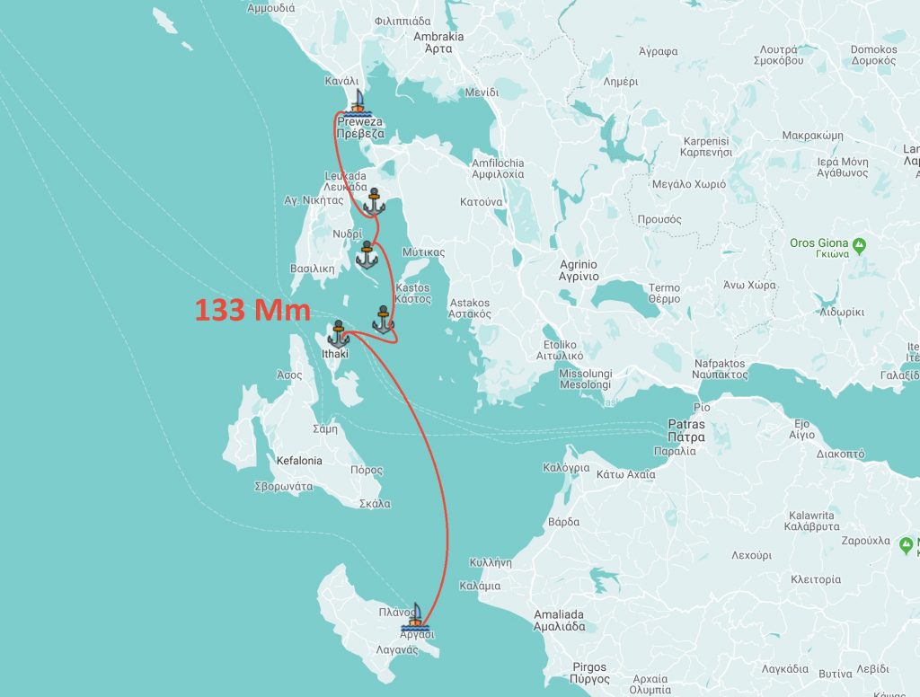 Odwiedzone miejsca: Kioni (kotwica), Atokos (kotwica), Meganisi (kotwica), Politriki (kotwica), Vathi, Ag. Nikolaos (kotwica)