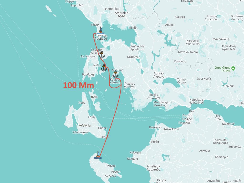 Odwiedzone miejsca: Kastos (kotwica), Vathy Meganisi (kotwica); Choironisi (kotwica)