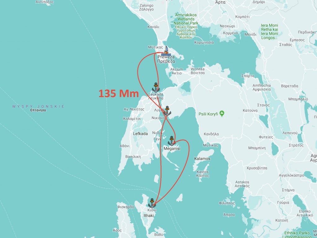 Odwiedzone miejsca: Kanał Levkada (kotwica); Vathy Meganisi (kotwica), Kioni (kotwica), Choironisi (kotwica)