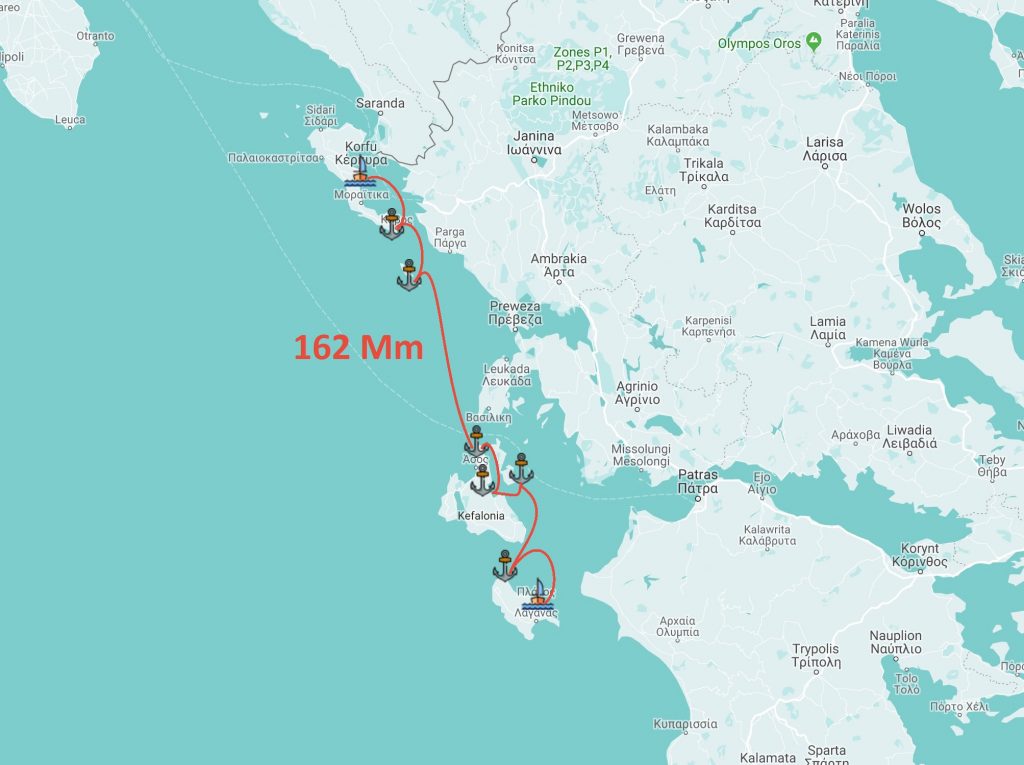 Odwiedzone miejsca: Kavos (kotwica); Longos (kotwica), Antipaxio (kotwica); Fiskardo (kotwica), Kalo Limani Cove (kotwica); Ag Efnmia, Ormos Pera Pigadhi (kotwica); Ay Nikolaos (kotwica), Ay Nikolaos