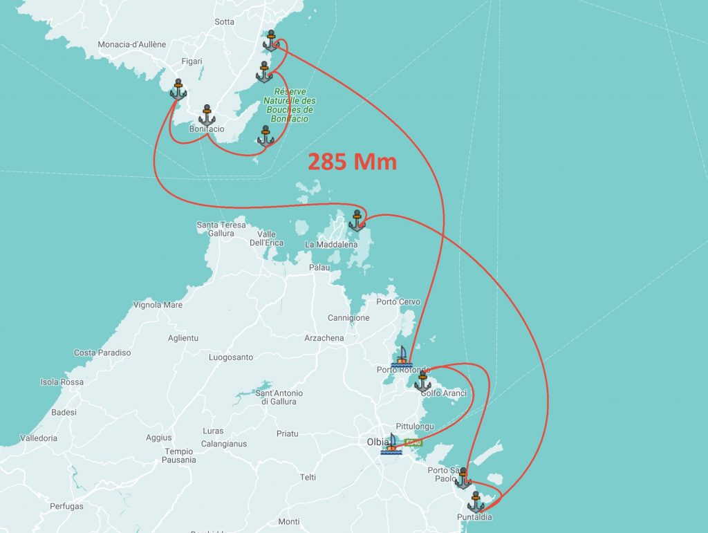 Odwiedzone miejsca: Porto Rotondo (kotwica); Golfo di Marinella (kotwica); Porto della Taverna (kotwica); Porto Brandinchi (kotwica); P.ta di li Cossi (kotwica); Cala Napoletana (kotwica); Bonifacio; Porto Palma (kotwica); Port di Olbia; Isola Rossa (kotwica); Golfe de Ventilegne (kotwica); Bonifacio (kotwica); Cala di Palma (kotwica); Golfo di Rondinara (kotwica); Golfe de Santa Giulia (kotwica); Golfe di Porto Novo (kotwica)