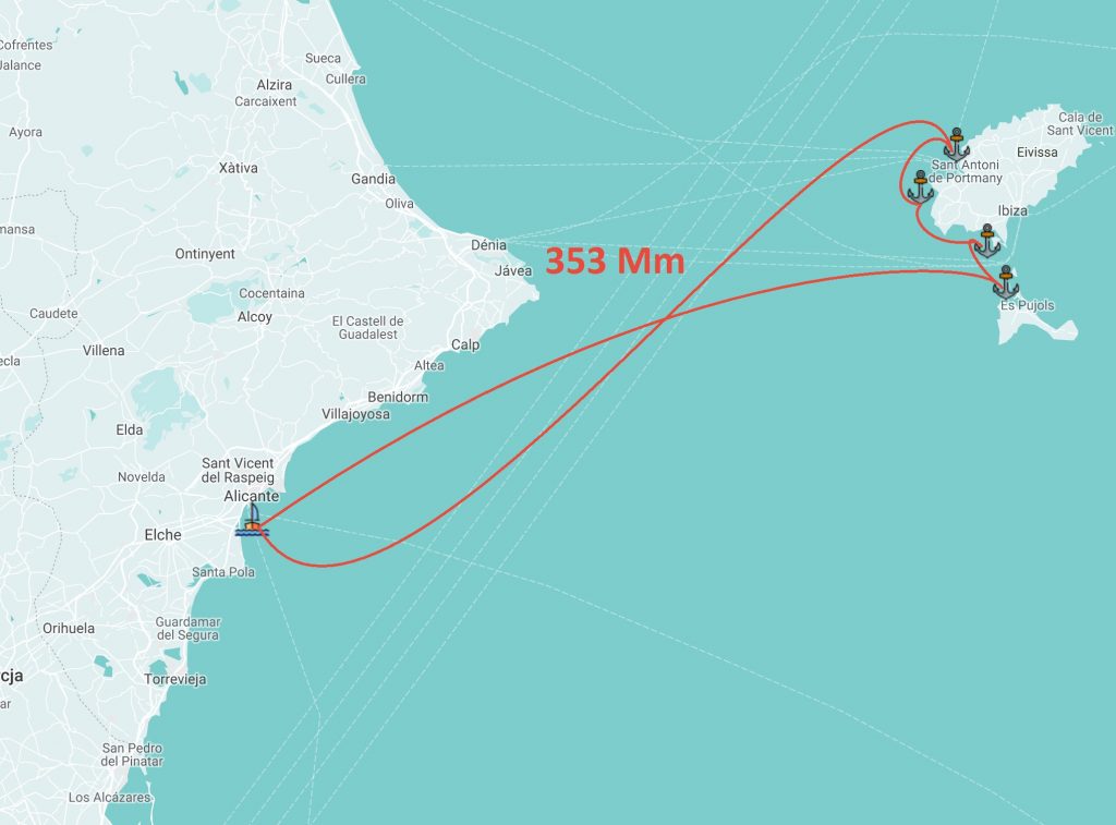 Odwiedzone miejsca: Formentera (kotwica); Playa de illetas (kotwica); La Savina; Port Brut (kotwica); Calla Vedella; Sant Antonio
