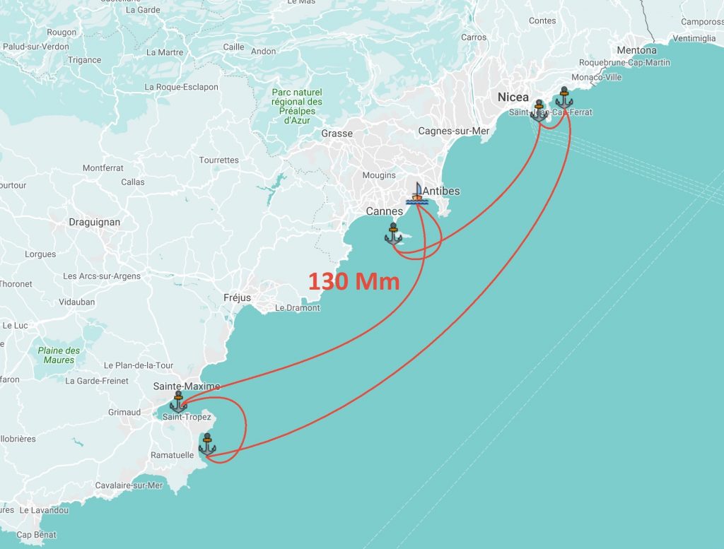 Odwiedzone miejsca: Saint-Tropez (kotwica); Pampelonne (kotwica); Cambiers (kotwica); Baile de Beaulieu (kotwica); Rade de Villefranche (kotwica)