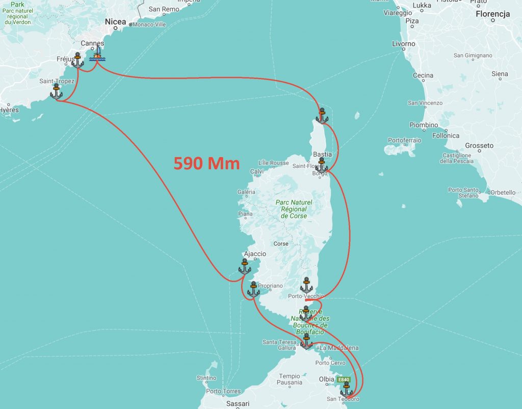 Odwiedzone miejsca: Rade d’Agay (kotwica); Saint-Tropez (kotwica); Baie de Briande (kotwica); Iles Sanguinares (kotwica); Campomoro (kotwica); Porto Liscia (kotwica); Porto Paglia (kotwica); Porto della Taverna (kotwica); Porto Brandinchi (kotwica); Cala Garibaldi (kotwica); Golfe de Porto Novo (kotwica); Golfe de Pinarellu (kotwica); Bastia (kotwica); Finocchiarola (kotwica); Baile de Beaulieu (kotwica); Ile Sainte-Marguerite (kotwica); Saint-Tropez (kotwica); Iles de Lerin (kotwica)