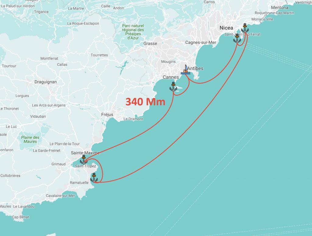 Odwiedzone miejsca: Golfe Juan Bay (kotwica); Iles de Lerin (kotwica); Saint-Tropez (kotwica); Pampelonne (kotwica); Rade de Cannes (kotwica); Baile de Beaulieu (kotwica); Rade de Villefranche (kotwica)